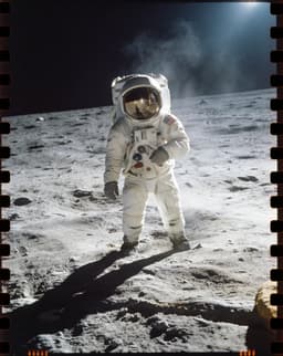 A solitary figure on the lunar surface, captured through deteriorating film stock. The sprocket holes frame humanity's most distant footstep — an archival ghost walking between documentation and dream.
