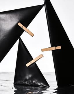 Black latex folds into angular geometric planes, secured by wooden clothespins — domestic object meets industrial material in a studio-lit confrontation. Darkness made physical, pinned down and displayed.