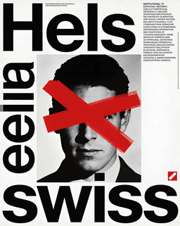 스위스 인터내셔널 스타일을 해체하고 훼손하다. 대담한 헬베티카 활자가 폭력적인 빨간 X로 표시된 초상을 압도한다 — 모더니스트 그래픽 디자인에 보내는 러브레터이자 항의서, 그 유산을 동시에 존경하고 파괴한다.