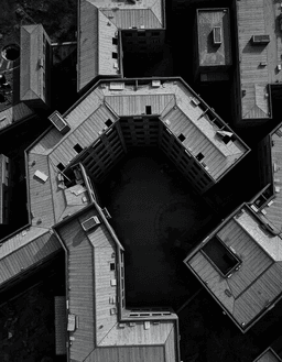 An aerial view of industrial collapse becomes abstract pattern. Rooftops, courtyards, and corridors of an abandoned Soviet complex form an accidental geometry of decay. Tarkovsky's Zone captured from above — beauty written in structural failure.